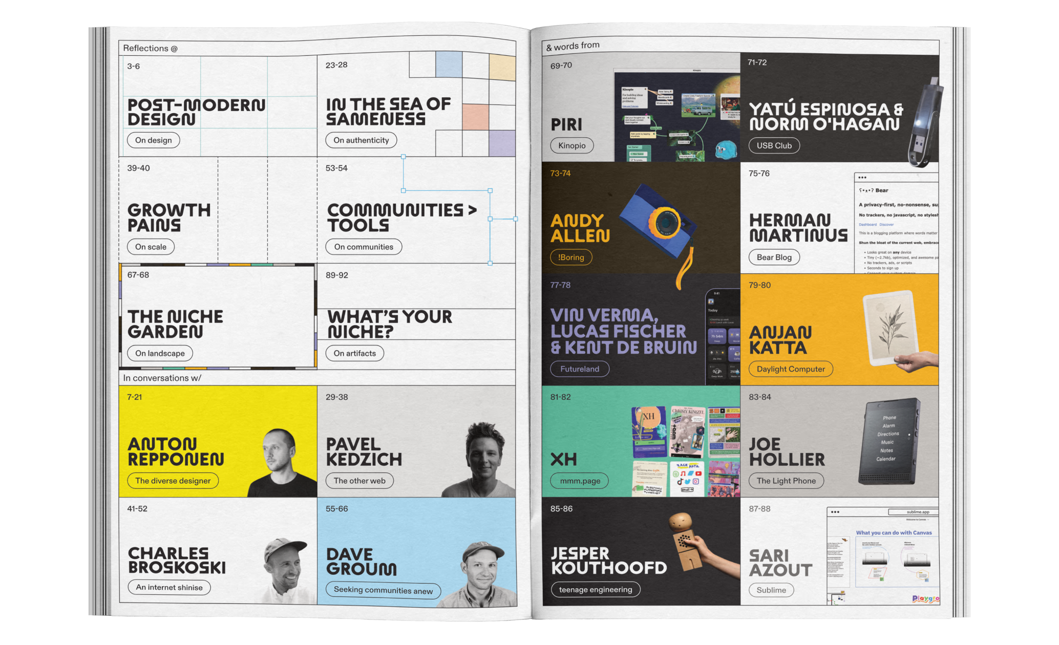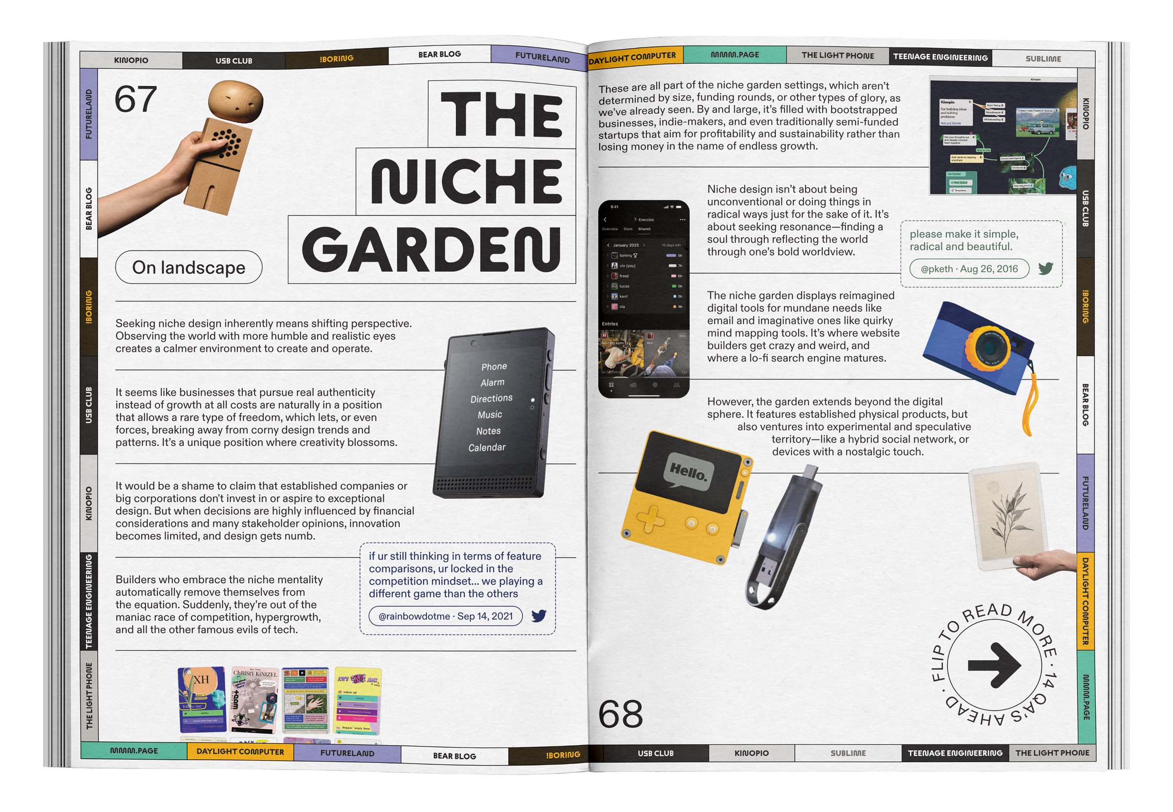 Niche design is a self-published magazine for designers and product makers seeking meaning beyond metrics. It invites you to rethink our culture through the ways we shape it.